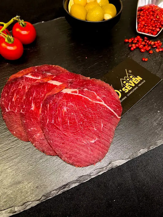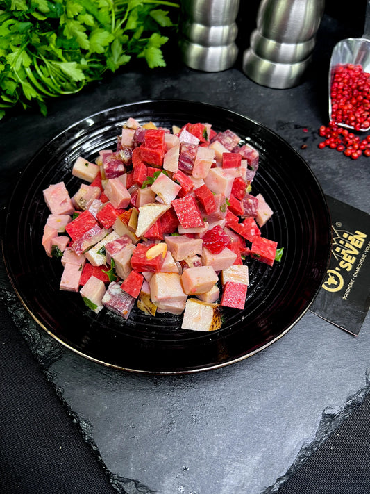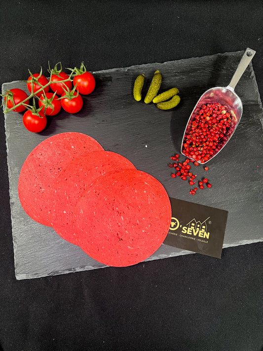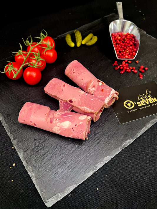 Chez O'Seven vous avez le choix parmi notre large gamme de charcuterie pour tous les goûts. Retrouvez la dinde sous différents formats, le pickel de Bœuf, l'excellent salami tunisien, le saucisson sec (rosette), le très populaire Veau pressé et bien d'autres charcuteries à disposition que nous découpons selon vos préférences. Nous proposons également notre Salade charcuterie qui rassemble parfaitement plusieurs morceaux de différentes variétés. Notre équipe d'experts vous régalera avec d'autres préparations maison également disponibles. Faites vous plaisir en réalisant votre plus beau plateau et en dégustant la fraicheur et la qualité de nos différentes charcuteries.